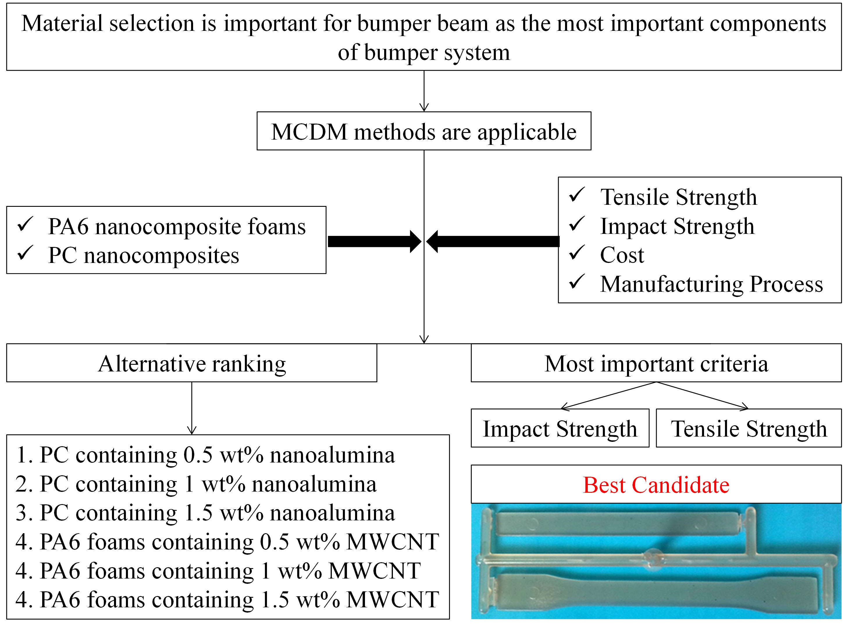 Material selection is a main purpose in design process and plays an important role in desired performance of the products for diverse engineering applications. In order to solve material selection problem, multi criteria decision making (MCDM) methods can be used as an applicable tool. Bumper beam is one of the most important components of bumper system in absorbing energy. Therefore, selecting the best material that has the highest degree of satisfaction is necessary. In the present study, six polymeric nanocomposite materials were injection molded and considered as material alternatives. Criteria weighting was carried out through analytical hierarchy process (AHP) and Entropy methods. Selecting the most appropriate material was applied using technique for order preference by similarity to ideal solution (TOPSIS) and the multi-objective optimization on the basis of ratio analysis (MOORA) methods respect to the considered criteria. Criteria weighting results illustrated that impact and tensile strengths are the most important criteria using AHP and Entropy methods, respectively. Results of ranking alternatives indicated that polycarbonate containing 0.5 wt% nano Al2O3 is the most appropriate material for automotive bumper beam due to its high impact and tensile strengths in addition to its low cost of raw material. Also, the sensitivity analysis was performed to verify the selection criteria and the results as well.